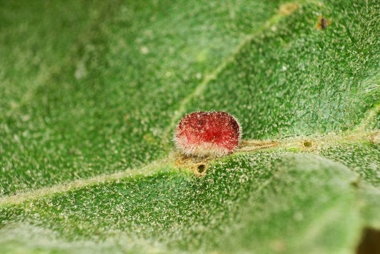 Small gall on an oak leave (Hymenoptera: Cynipidae) with an diameter of 3 mm! Inside of this gall there is a small larva of a wasp.